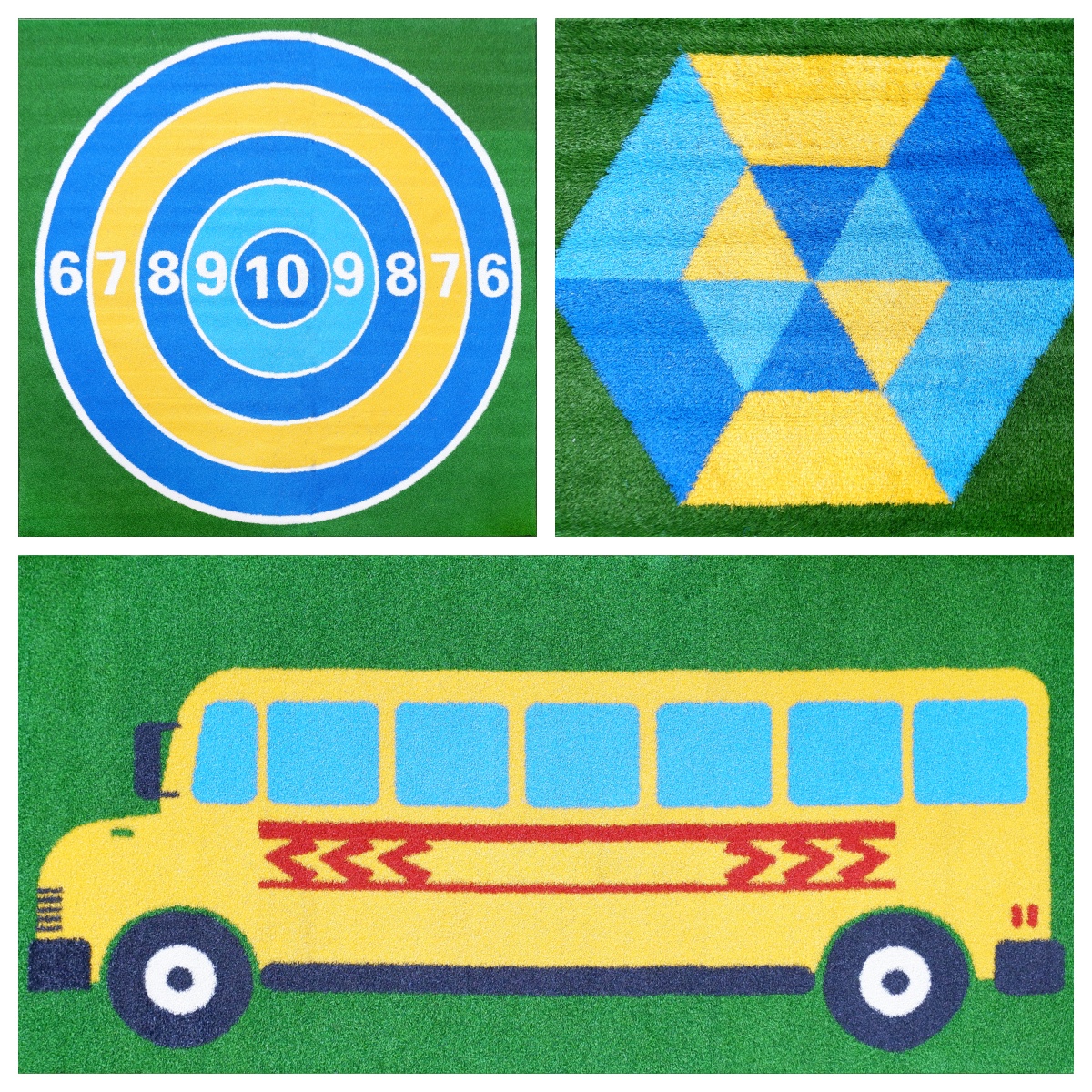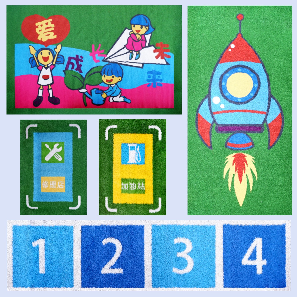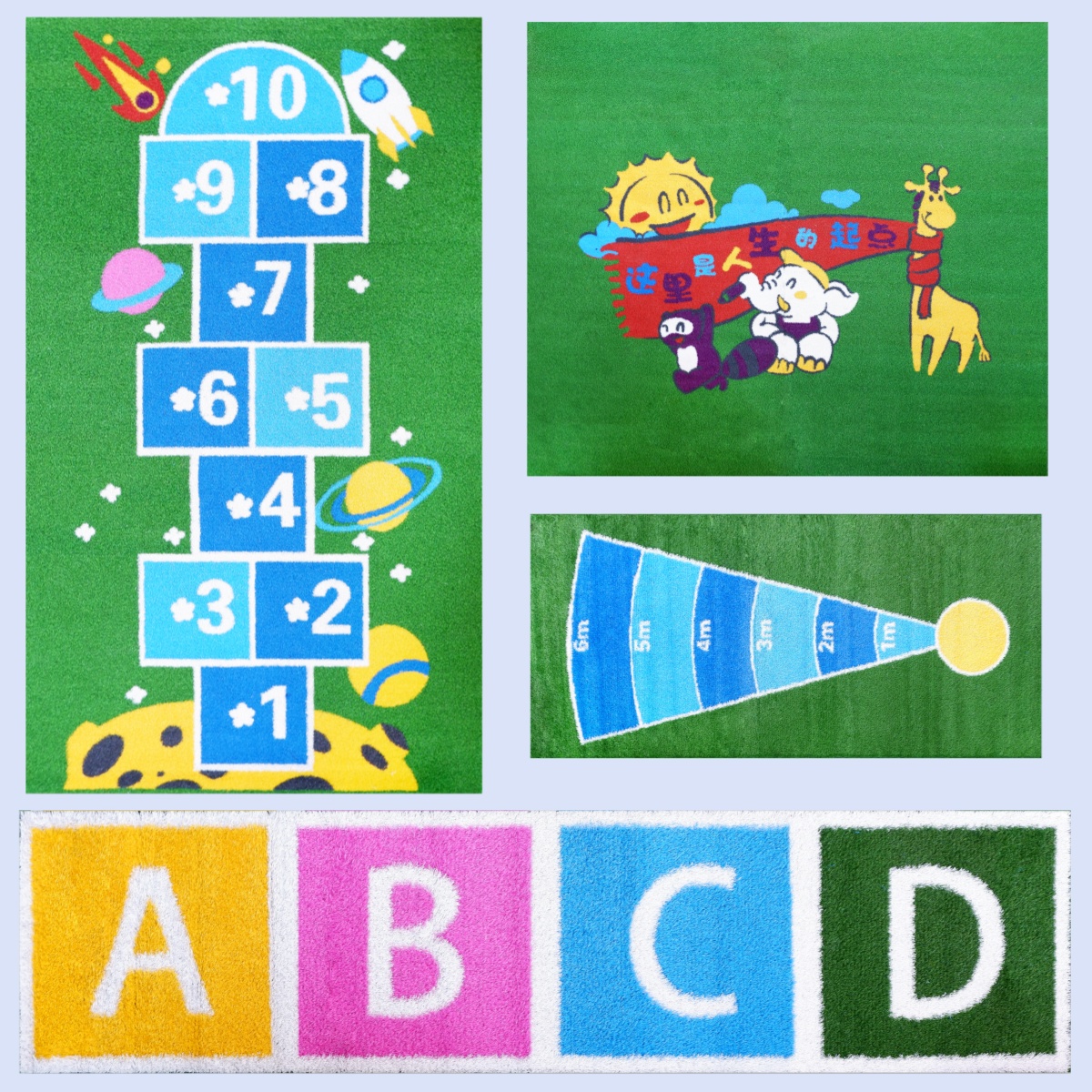 Customized patterned lawns for kindergartens are products designed to meet the diverse needs of kindergartens and create better activity spaces for children. They are suitable for outdoor activity areas, children's playgrounds, parent-child interaction areas, etc., providing safe, comfortable, and clean play spaces for children. There are various patterns such as jumping patterns, jumping houses, parking lots, gas stations, and simulated lanes that are suitable for physical fitness. With novel shapes, bright colors, and vivid images, it can create a fairy tale like cartoon world, exercise children's various sports skills, and promote the harmonious development of children's body and mind from multiple aspects. While beautifying the kindergarten environment, it can also cultivate children's safety awareness. Various animal patterns, numerical letters, traffic signs, etc. can be customized according to the theme and needs of the kindergarten, integrated into the kindergarten culture and educational philosophy, and achieve the goal of "one kindergarten, one system, one characteristic".